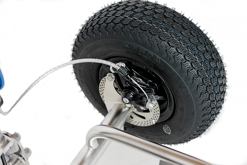 Il manico è regolabile in altezza ed il carrello è facilmente trasportabile dato che si ripiega in pochi secondi con due semplicissimi movimenti. Il TK 150 inox è disponibile con doppio freno a disco idraulico posteriore, frenando si esclude l’elettronica e rilasciando la leva del freno il carrello riparte dolcemente ritornando alla velocità precedentemente selezionata.
